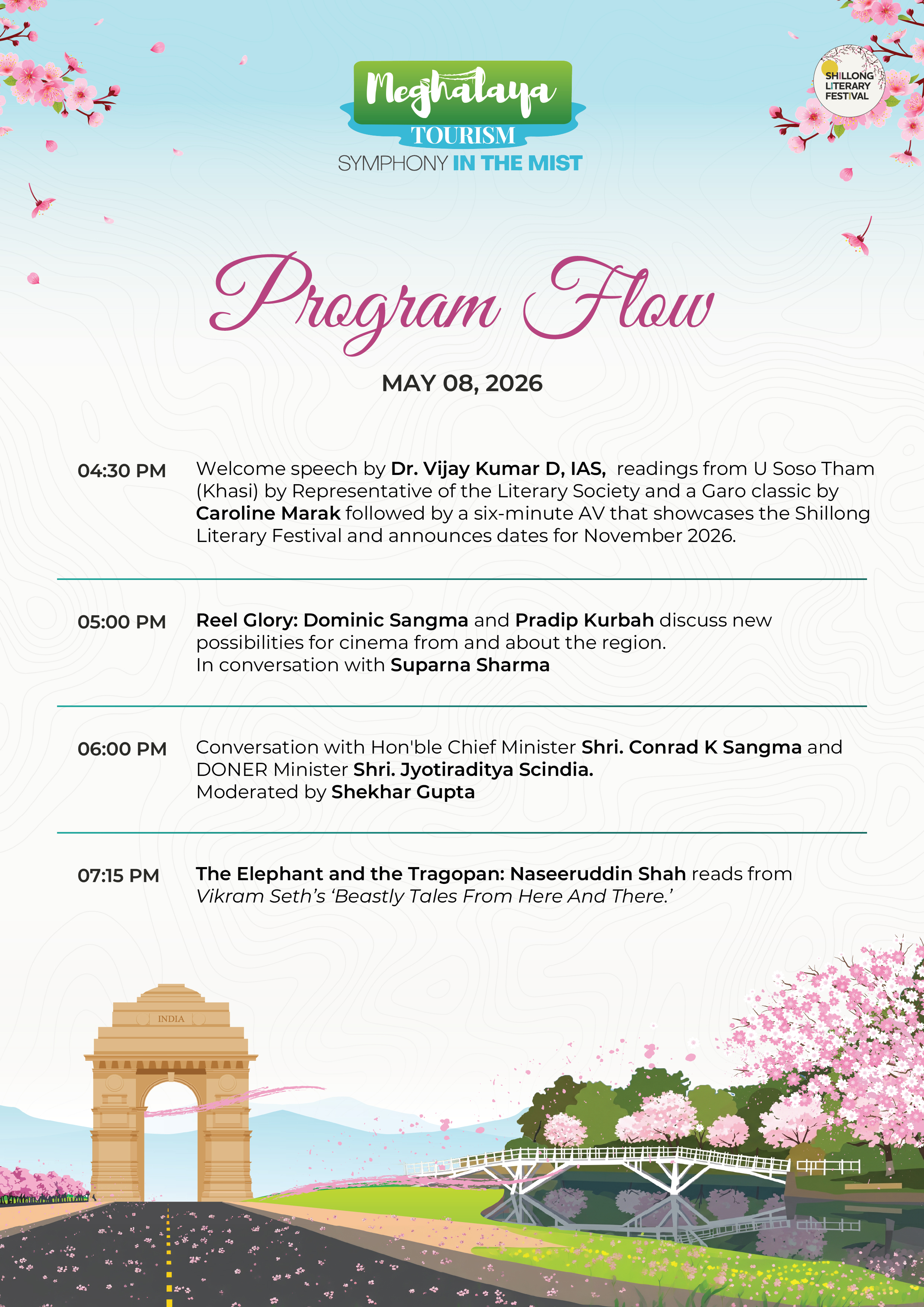 The 4th Shillong Literary Festival (Nov 18–20, 2024) featured Shobhaa De, Kynpham Sing Nongkynrih, Jerry Pinto, and H.E. Firat Sunel, with book launches, talks, and vibrant performances.